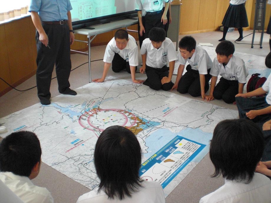 今回は「火山防災とジオパーク」というテーマで授業を行いました。 最初に、火山防災マップの利用の良い例と悪い例を紹介し、防災マップの理解が重要であることを説明。 次に、裏磐梯のすばらしいところについて、各学年の代表が発表。 次に、ジオパークについて説明し、磐梯山をジオパークにしようと提案。