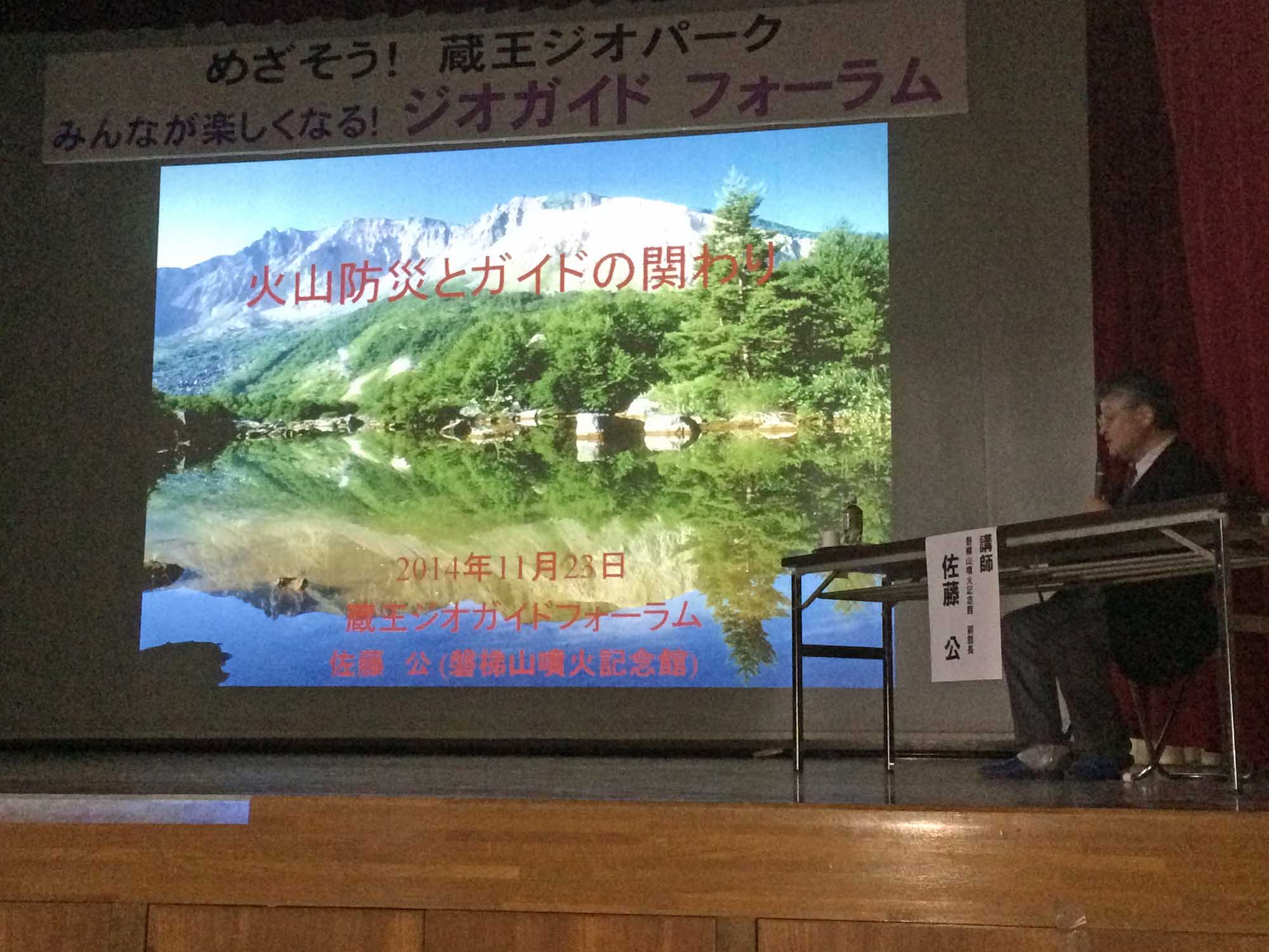 2014年11月23日、宮城県蔵王町において、「めざそう蔵王ジオパーク みんなが楽しくなるジオガイドフォーラム」 が遠刈田地区公民館で開催された。当館の学芸員が「火山防災とガイドの関わり」というテーマで基調講演を行った。